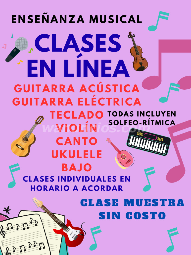 Clases en línea de: Guitarra acústica, eléctrica,Teclado, Violín, Canto, Ukulele, Bajo. Entrenamiento auditivo. Todas incluyen solfeo-rítmica.